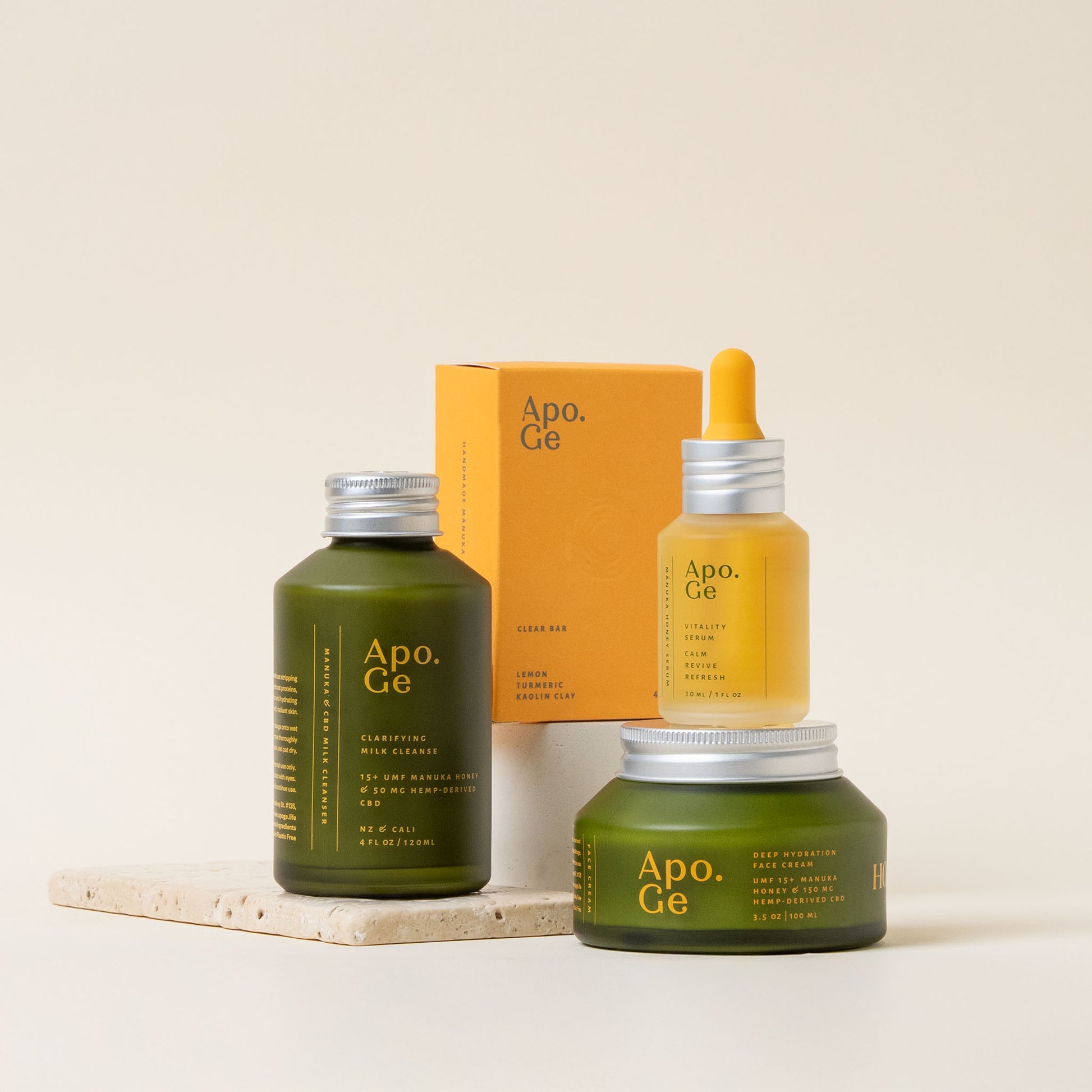 Includes: Clarifying Milk Cleanse, Vitality Serum, Deep Hydration Face Cream, and Clear Bar